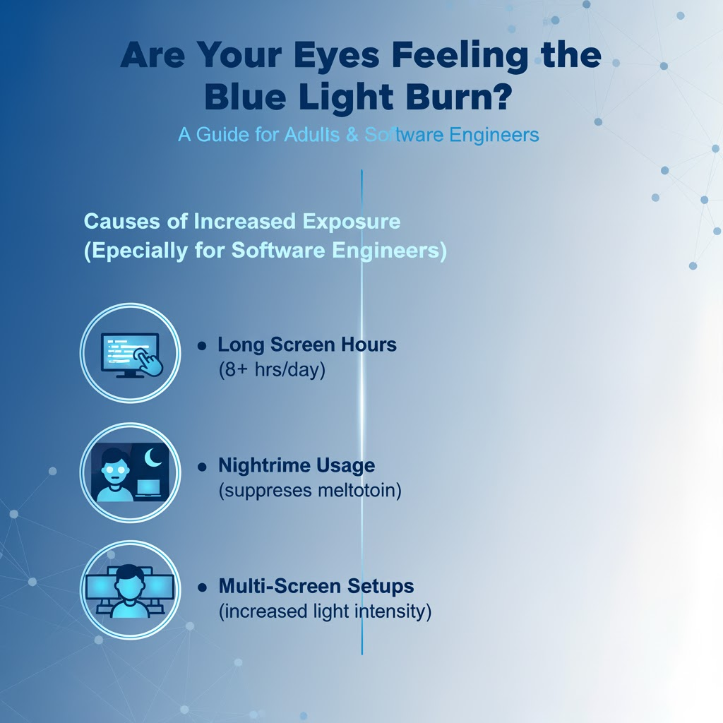 • Prolonged Screen Time: Software engineers often spend 8+ hours a day coding, debugging, and testing, directly exposing them to screens for extended periods.